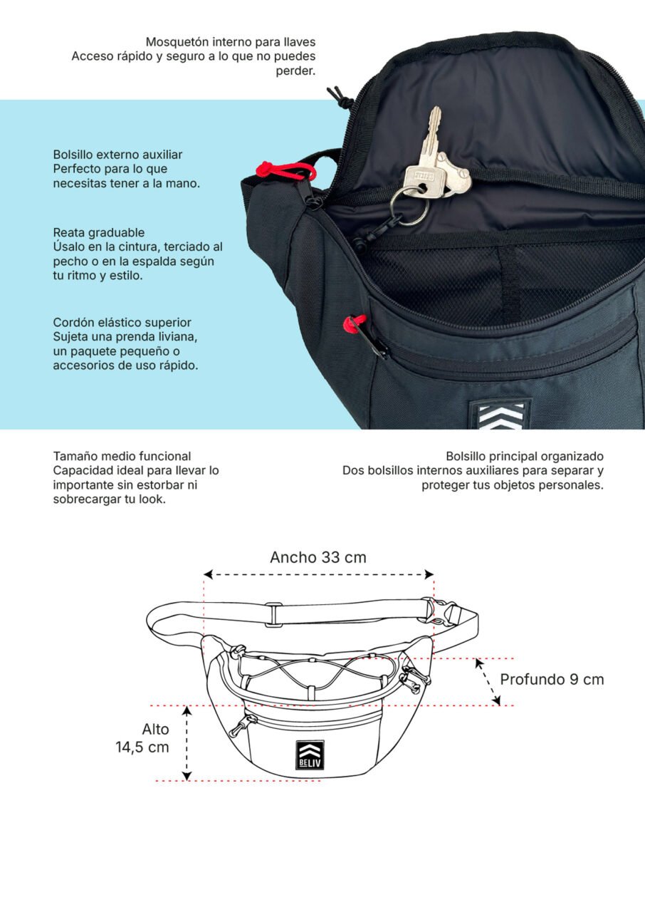 Diseñado para el día a día urbano o en campo, Canguro Tradi equilibra funcionalidad y estilo en un formato versátil de tamaño medio. Organiza lo que más cuidas, complementa tu outfit sin esfuerzo y adáptalo a tu forma de moverte: en la cintura, terciado al pecho o a la espalda.