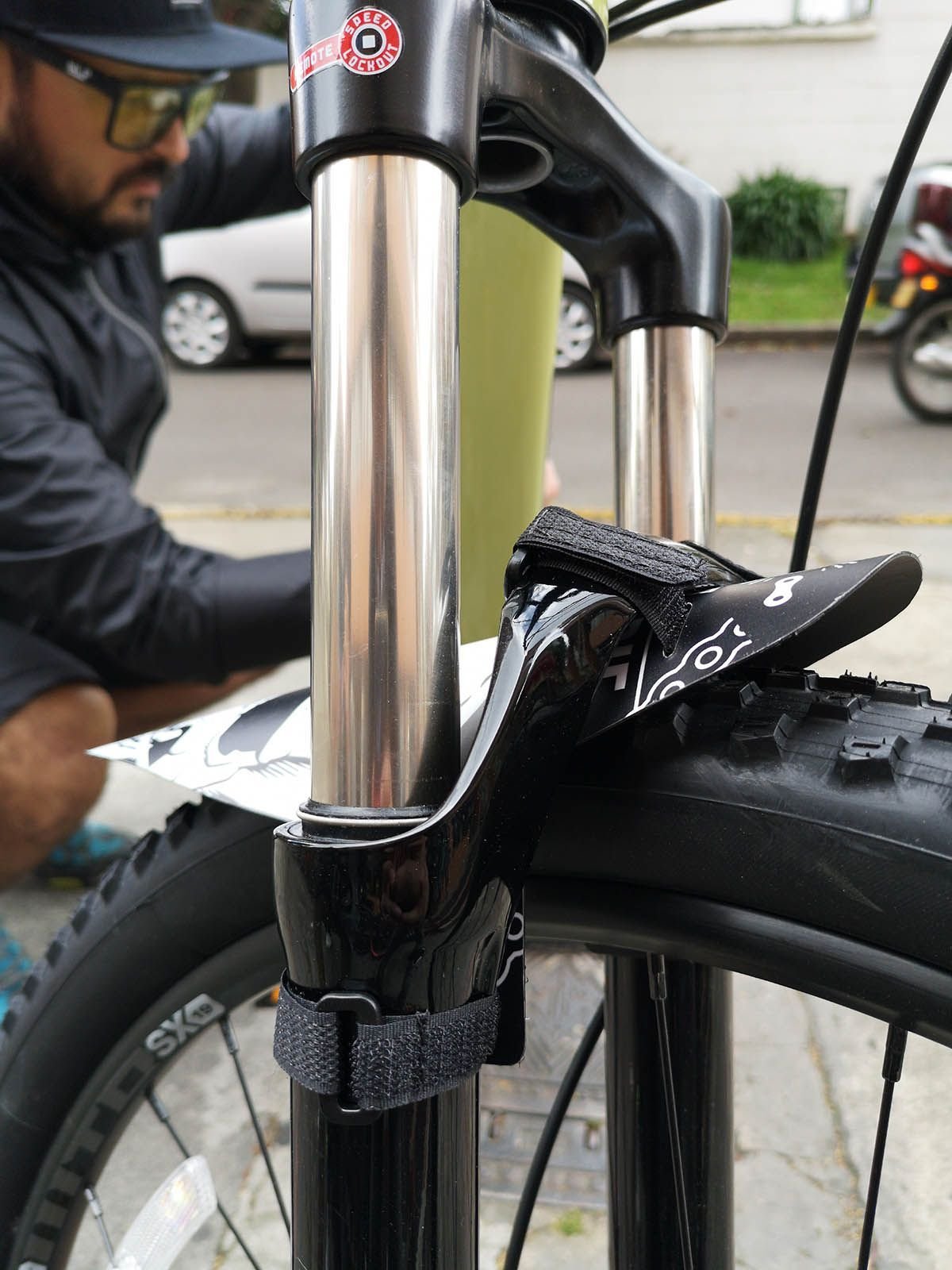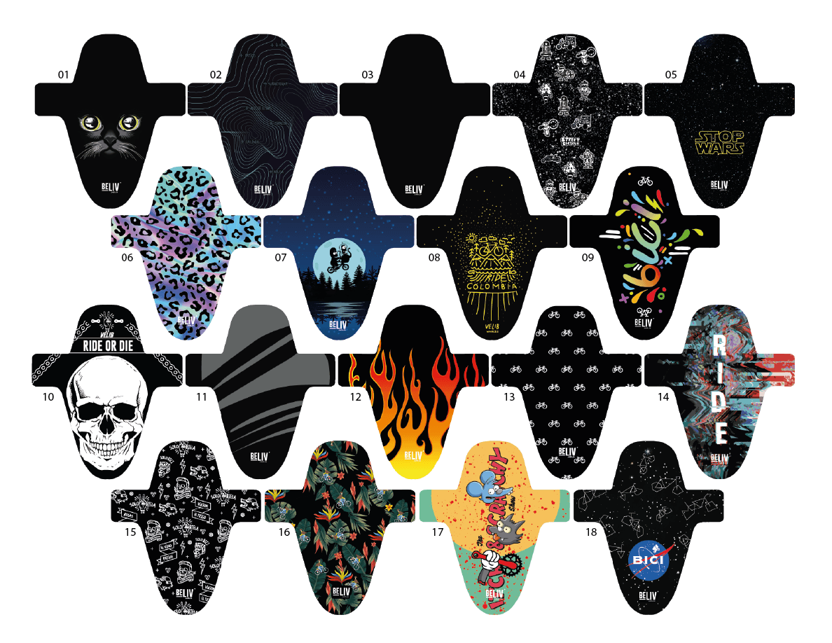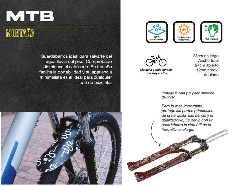 Además de proteger el salpicado a la cara, alarga la vida útil de la horquilla / tenedor ya que evita que se llenen de barro los tubos de la horquilla. Es fabricado en un plástico de excelente resistencia a la intemperie, no se cristaliza como otros plásticos del mercado porque nuestro plástico tiene composición polimérica especial bajo especificaciones de nuestros diseñadores. La decoración tiene un recubrimiento con protección UV. Únicos en el mercado con garantía de 1 año!!! Se instala con unas correas de velcro, puedes soltarla fácilmente y quitar el guardabarros cuando lo desees. Medida total aproximada: (las medidas se toman por la parte más ancha o más larga que tenga el producto) 24cm X 28cm